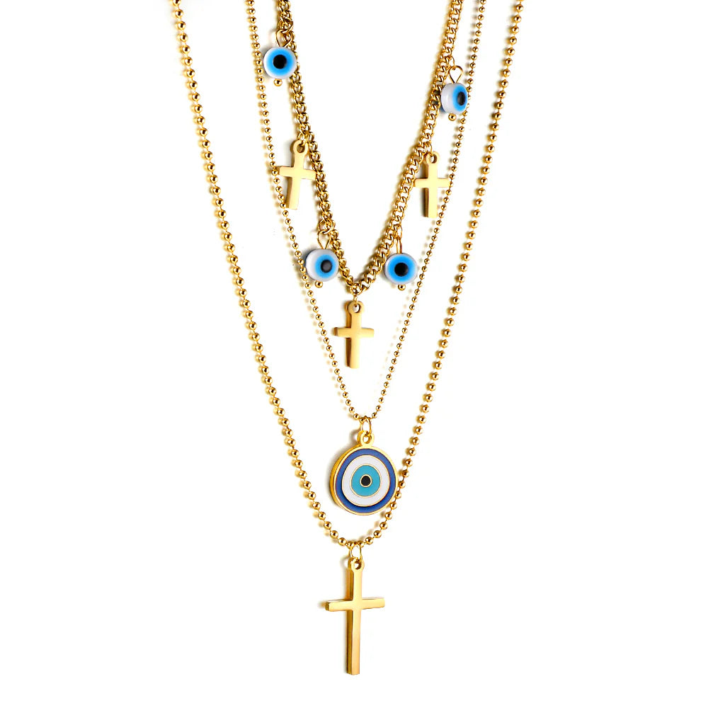 Ce collier triple chaîne est orné d'élégantes breloques croix et mauvais œil, conçues pour offrir protection et éloigner les énergies négatives. Son design superposé ajoute profondeur et style, ce qui en fait un accessoire accrocheur alliant symbolisme et praticité au quotidien. Idéal pour celles qui recherchent à la fois réconfort spirituel et sophistication moderne.