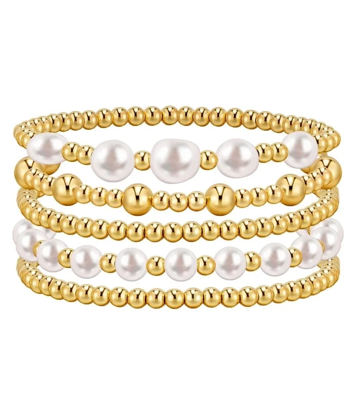 Elevate your wrist game with Pearlay, a stunning set of five beaded elastic bracelets that blend timeless romance with modern flair. Each bracelet features lustrous gold and white faux pearls strung on stretchy elastic, creating an effortlessly chic look that works solo or stacked. Perfect for layering, gifting, or mixing and matching with your everyday style. Whether you're dressing up for a special occasion or adding a touch of elegance to casual wear, these beauties deliver sophistication with a playful twist. Stack them, swap them, love them.