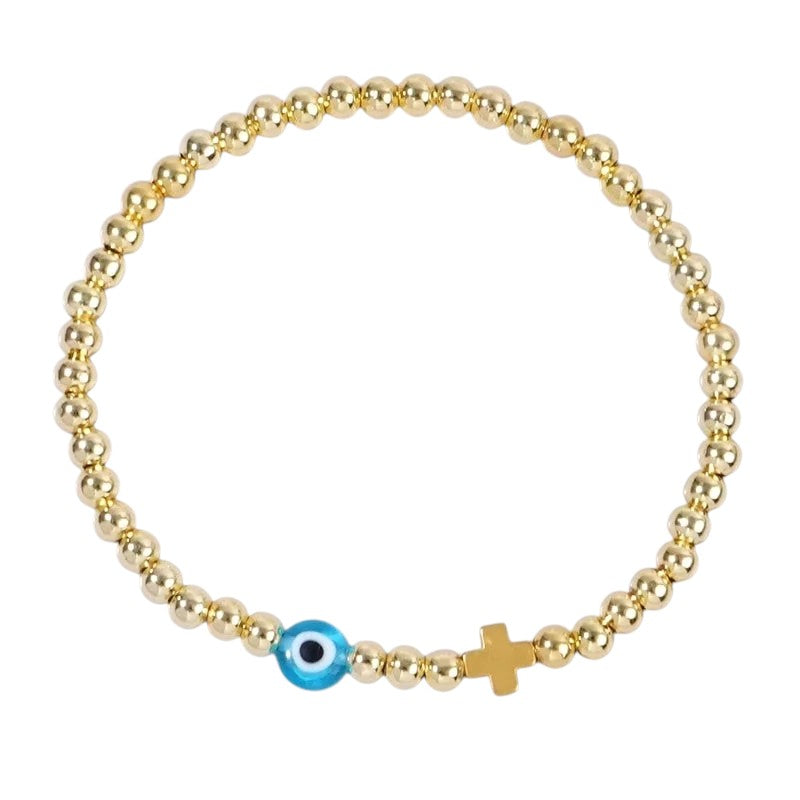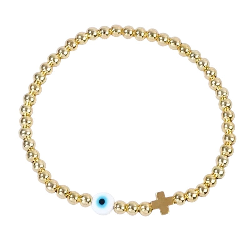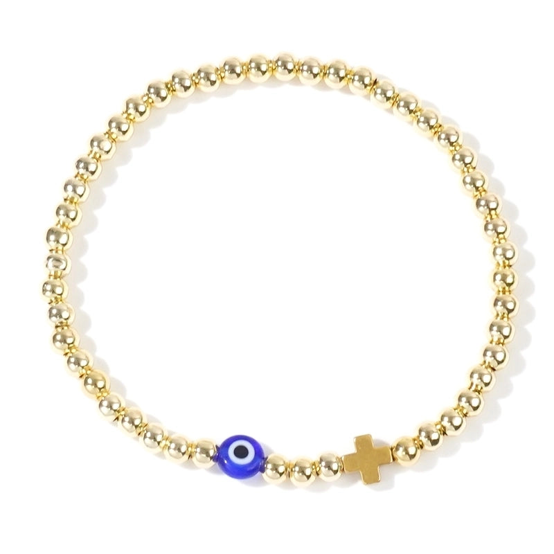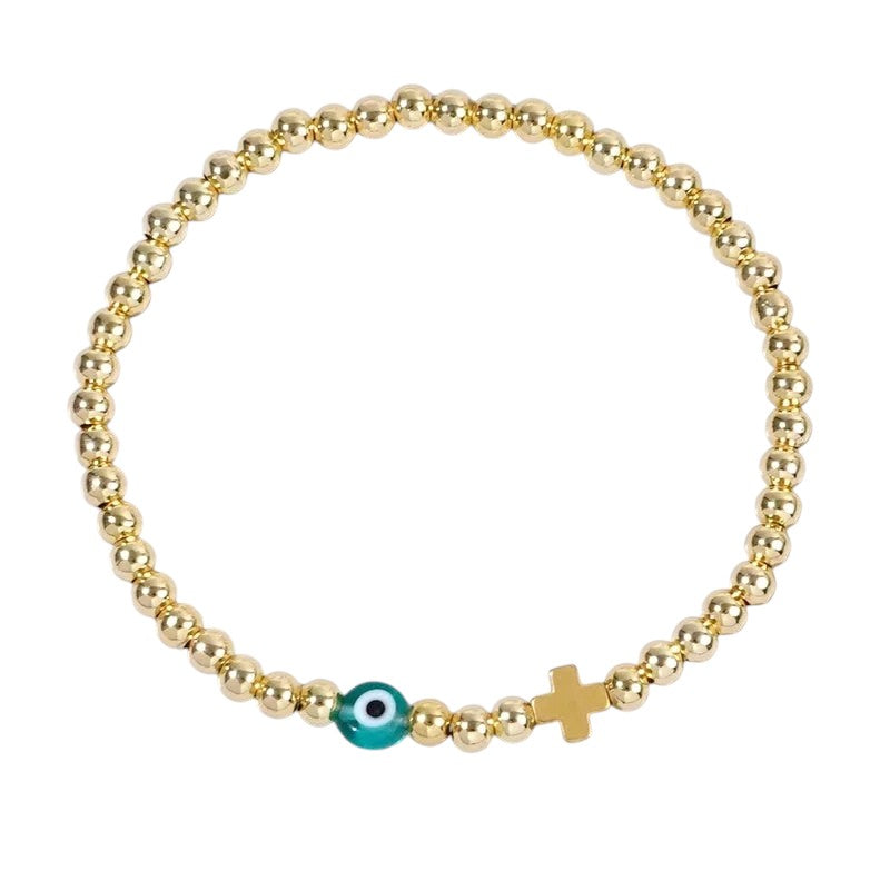 Slip on the Athena and let this charming beaded elastic bracelet be your spiritual sidekick. Adorned with a delicate cross and a watchful evil eye charm, it's designed to keep negative vibes at bay while adding a touch of mystical flair to your wrist. Perfect for those who believe in a little protective magic mixed with everyday style. Stack it with your favorites or wear it solo, either way, you've got celestial backup.